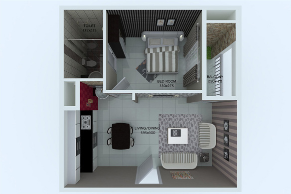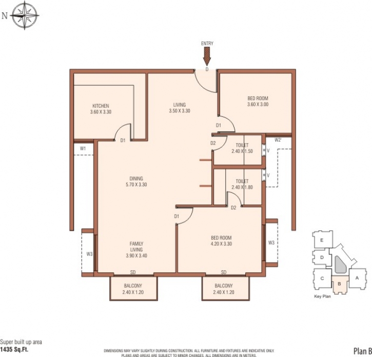 Ceramic tiles for floors and glazed tiles up to false ceiling. Concealed pipes and CP fittings. Hot and cold water taps with overhead shower and piping for geyser in all bathrooms. White/Ivory cascade sanitary ware and counter top wash basin in bathrooms and dining space. Provision for exhaust fan.