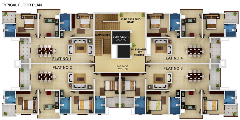 For lifts, common lights, water pumps etc. Selected points in apartments – One light point each in living room, master bedroom and Kitchen. Fan point in master bedroom, TV point in living room.
